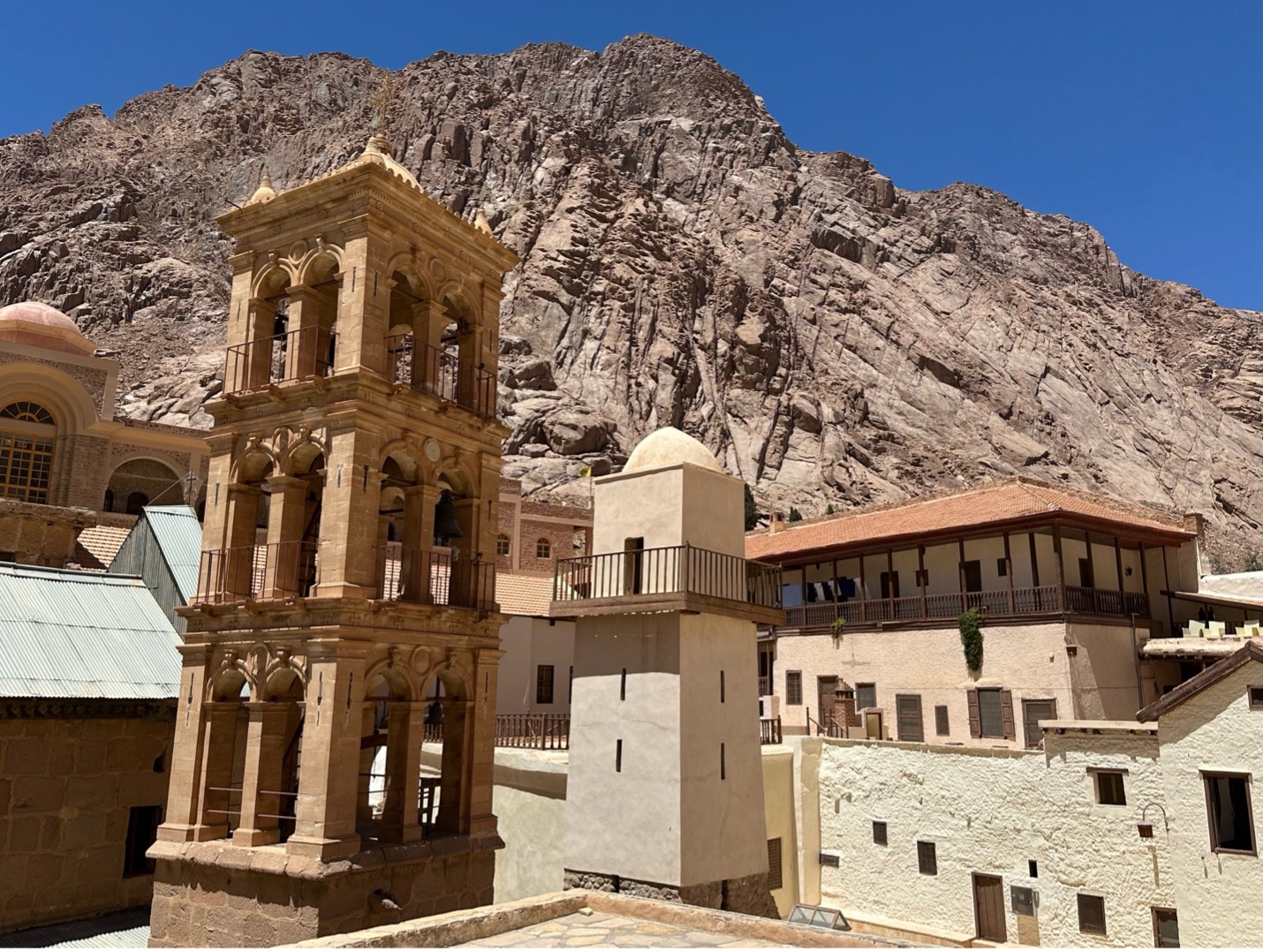 [Ben Hoffler provided photos showing works with the monastery seen at the foot of Mount Sinai. “The colours, geometry, styles and construction materials are alien to St Catherine and its traditional kind of architecture.”]