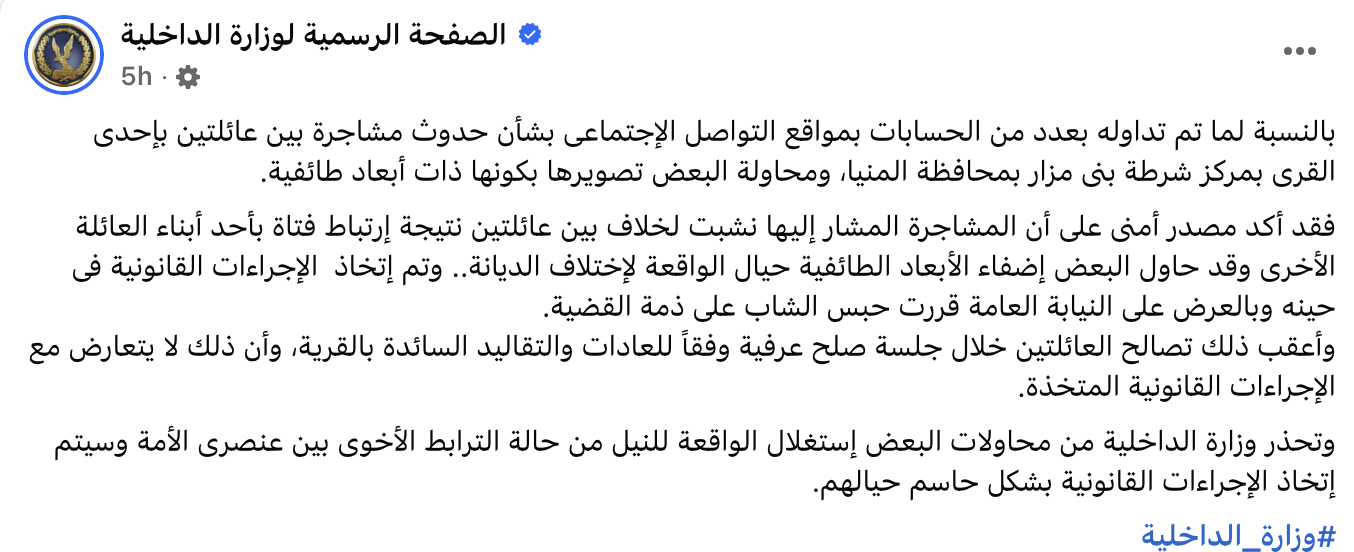 With regard to what has been circulated on several social media accounts concerning a dispute between two families in a village in the Beni Mazar district of Minya Governorate, and attempts by some to portray it as a sectarian incident: