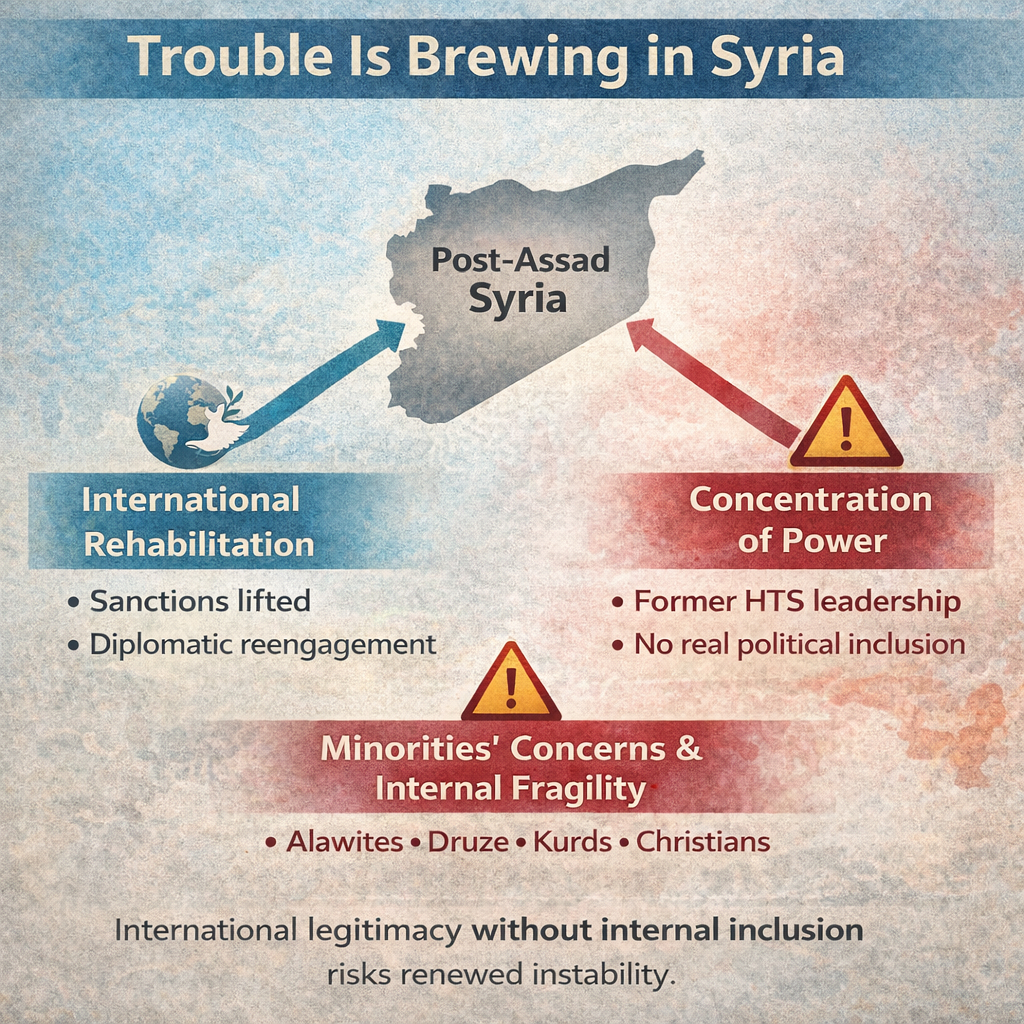 Parliament, selected through a tightly managed process overseen by committees appointed by Shara, holds limited power. Women remain severely underrepresented, occupying just six of 119 seats. Many Syrians therefore fear they are not witnessing a transition toward pluralism but the consolidation of a new authoritarian system—one that is internationally accepted but domestically unaccountable.