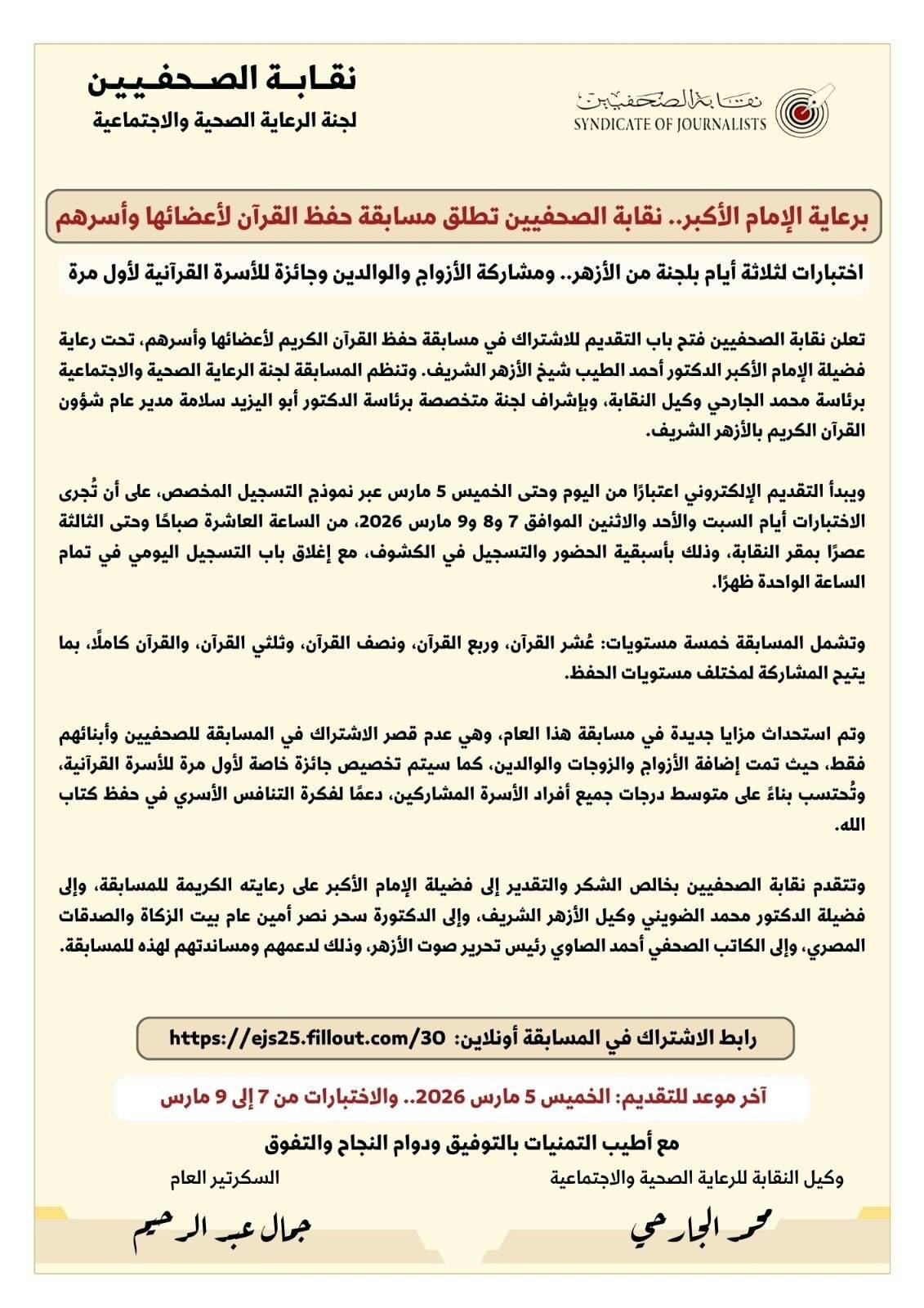 The Social Care Committee of the Egyptian Journalists’ Syndicate has officially launched a Quran memorization competition for members and their families. The event is held under the prestigious patronage of His Eminence Professor Dr. Ahmed Al-Tayeb, Grand Imam of Al-Azhar.